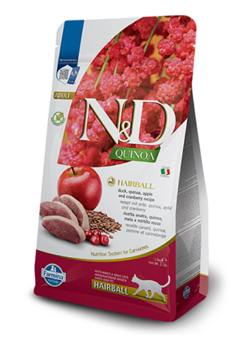 Пълноценна суха храна без зърнени култури за котки в зряла възраст против образуването на космени топки и за улесняване на изхвърлянето на погълнатите косми. Рецепта с патешко месо, киноа, ябълка и червена боровинка. Natural & Delicious Quinoa е функционална линия храни за възстановяване и поддържане на здравето на котки със специфични хранителни потребности. Всяка формула е без зърнени култури и с над 90% протеини от животински произход заедно с киноа, функционална супер-храна, и екстракти от растения с важни хранителни свойства, полезни за възстановяването на здравето на домашните любимци.
