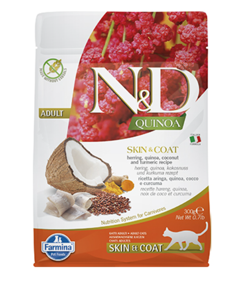 N&D QUINOA SKIN & COAT с херинга – Пълноценна храна за котки в зряла възраст с херинга, киноа, кокос и куркума. При хранителни чувствителности, полезна за възстановяване и поддържане на здравето на кожата и козината. Киноа е зеленчук, който е естествено устойчив на определени гъбички и плесени, благодарение на съдържанието на сапонини. Сапонините горчив вкус, който е неприятен за птиците, хранещи се със семена. Тези свойства позволяват на киноа да не се нуждае от специално третиране при отглеждането си, което води до по-здравословен и по-естествен зеленчук. Киноата съдържа около 15% протеин, с висока биологична стойност, богат на добре балансирани есенциални аминокиселин – много рядко срещано при зеленчуците. Тази специална формула има високо съдържание на животински съставки (над 96%) и киноа – супер-храна с уникални хранителни свойства, полезни за възстановяване на здравето на домашните любимци.