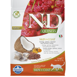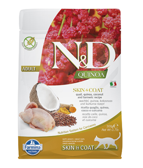 N&D QUINOA SKIN & COAT с пъдпъдъче месо – Пълноценна храна за котки в зряла възраст с пъдпъдъче месо, киноа, кокос и куркума. При хранителни чувствителности, полезна за възстановяване и поддържане на здравето на кожата и козината. Киноа е зеленчук, който е естествено устойчив на определени гъбички и плесени, благодарение на съдържанието на сапонини. Сапонините горчив вкус, който е неприятен за птиците, хранещи се със семена. Тези свойства позволяват на киноа да не се нуждае от специално третиране при отглеждането си, което води до по-здравословен и по-естествен зеленчук. Киноата съдържа около 15% протеин, с висока биологична стойност, богат на добре балансирани есенциални аминокиселин – много рядко срещано при зеленчуците. Тази специална формула има високо съдържание на животински съставки (над 96%) и киноа – супер-храна с уникални хранителни свойства, полезни за възстановяване на здравето на домашните любимци.