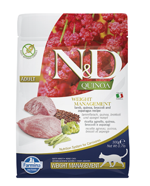 N&D QUINOA Weight Management – Пълноценна храна за котки в зряла възраст с агнешко, киноа, броколи и аспержи. За възстановяване и поддържане на идеално телесно тегло без лишаване от храна. Киноа е зеленчук, който е естествено устойчив на определени гъбички и плесени, благодарение на съдържанието на сапонини. Сапонините горчив вкус, който е неприятен за птиците, хранещи се със семена. Тези свойства позволяват на киноа да не се нуждае от специално третиране при отглеждането си, което води до по-здравословен и по-естествен зеленчук. Киноата съдържа около 15% протеин, с висока биологична стойност, богат на добре балансирани есенциални аминокиселин – много рядко срещано при зеленчуците. Тази специална формула има високо съдържание на животински съставки (над 96%) и киноа – супер-храна с уникални хранителни свойства, полезни за възстановяване на здравето на домашните любимци.