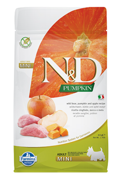 Mini Adult Boar & Apple – Пълноценна храна за кучета от дребни породи в зряла възраст с глиганско, тиква и ябълка. Без зърнени култури, с високо съдържание на животински съставки (над 60%) и тиква – зеленчук с уникални хранителни свойства. Състав: Прясно обезкостено глиганско (24%), дехидратирано глиганско месо (22%), скорбяла от грах (20%), дехидратирана тиква (5%), дехидратирани цели яйца, рибено масло, растителни фибри от грах, сушени моркови, сушена люцерна, инулин, фрукто-олиго-захариди, мано-олиго-захариди, сушена ябълка (5%), спанак на прах, псилиум (0.3%), нар на прах, касис на прах, сладък портокал на прах, боровинки на прах, натриев хлорид, сушена бирена мая, куркума (0.2%), глюкозамин, хондроитин сулфат, екстракт от невен (източник на лутеин).