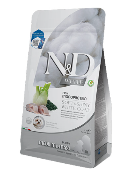 ЗА БЕЛИ КУЧЕТА ДО 1 ГОДИНА Medium & Maxi Puppy. Рецепта с лаврак, спирулина и фенел. Пълноценна храна без зърнени култури за кученца и бременни или кърмещи женски кучета с бяла козина от средни и едри породи.